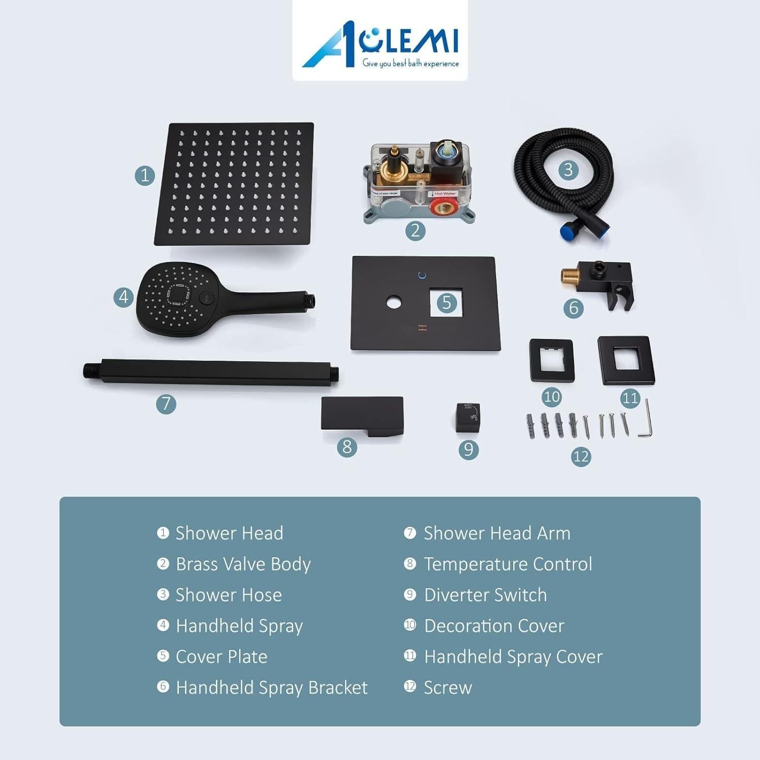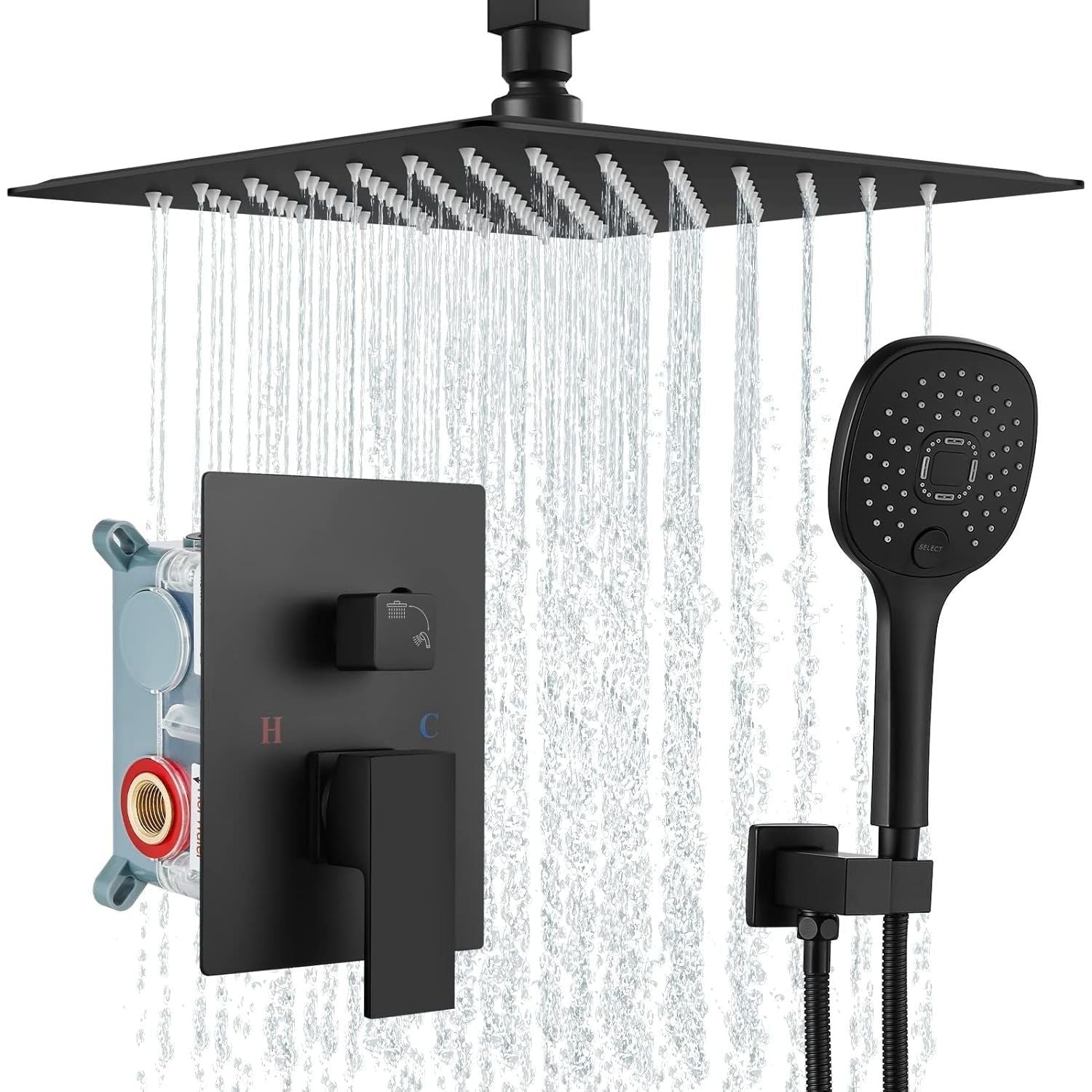 Aolemi Ceiling Mount 12 Inch Matte Black Shower System Rain Shower Head with ABS 3 Functions Handheld Spray Bathroom Luxury High Pressure Shower Combo Set Rough-in Valve and Shower Trim Included. Brand New. Open Box.