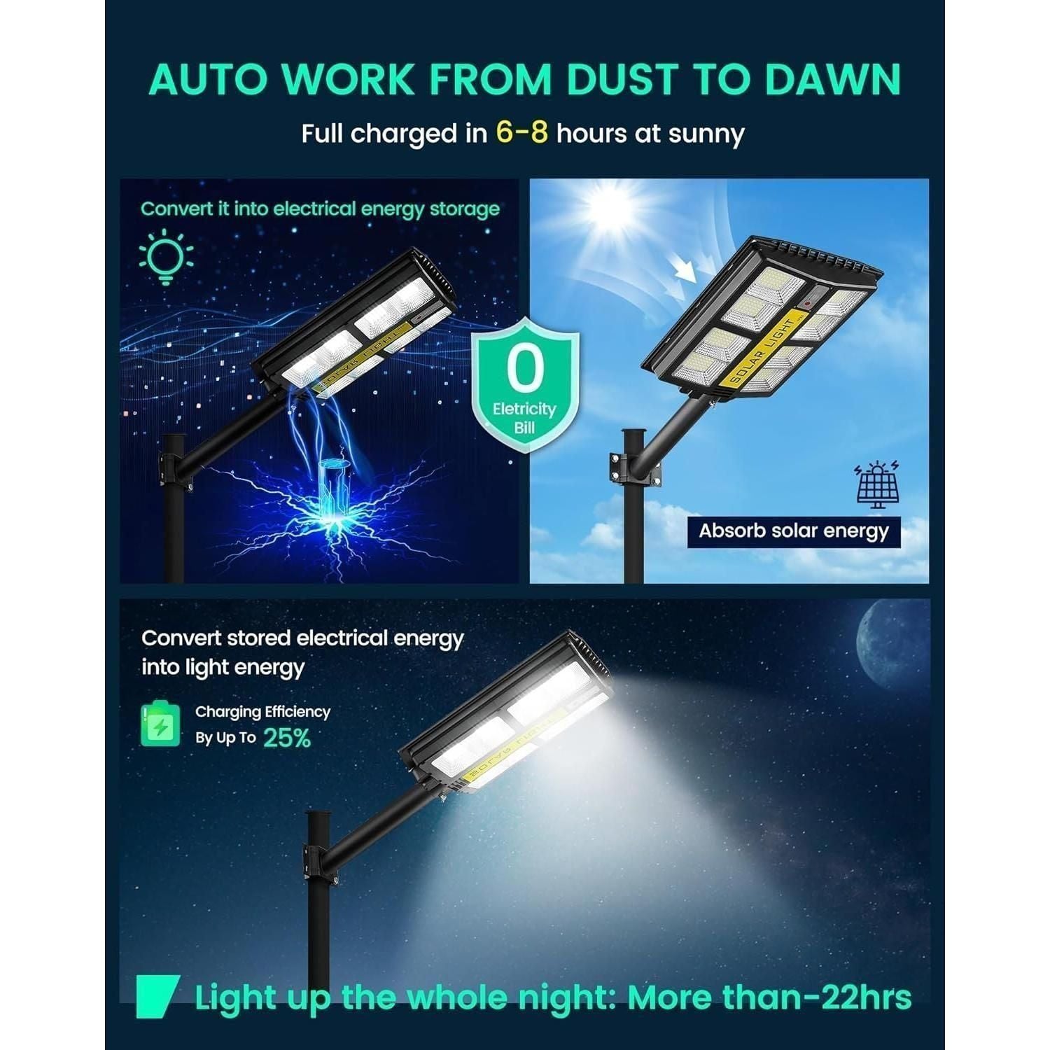 - 【Resistant And Waterproof】Street lights adopt a high-quality ABS and die-cast aluminum frame, which is sturdy and resistant, suitable for outdoor environments. Its working temperature is -13℉~149℉. IP67 waterproof makes the outdoor solar LED street light able to withstand outdoor hurricanes, snowfall, thunderstorms, and other harsh weather.