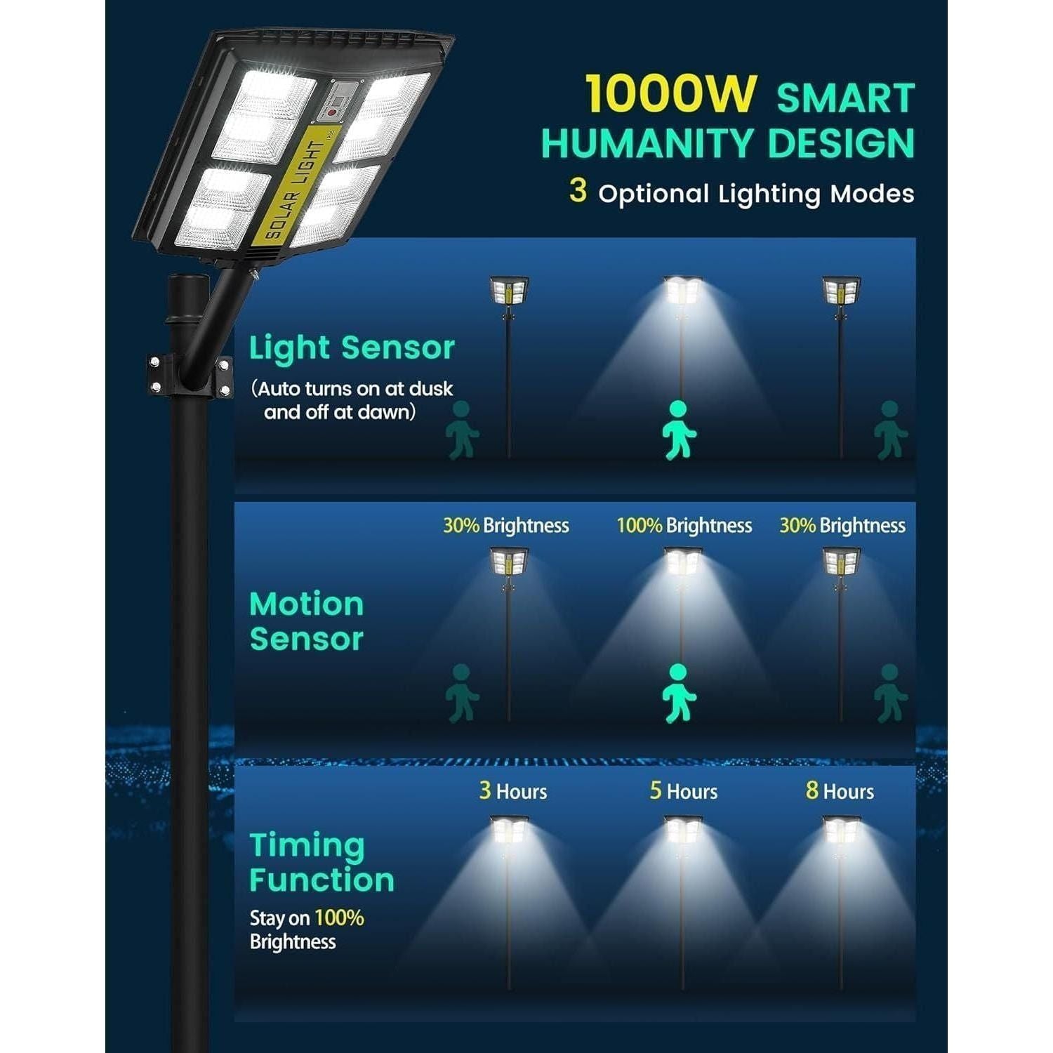 - 【Intelligent Control】The solar street lights come with a remote control providing convenient use in long-distance. You can choose different lighting modes: 1. Motion Sensor: Keep 30% power lighting until detected motion automatically adjusts to 100% power lighting, then return to 30% power brightness after the person leaves. 2. Always Lighting: Four gears of brightness can be adjustable. 3. Timed Lighting: 2H/3H/5H/6H/8H.