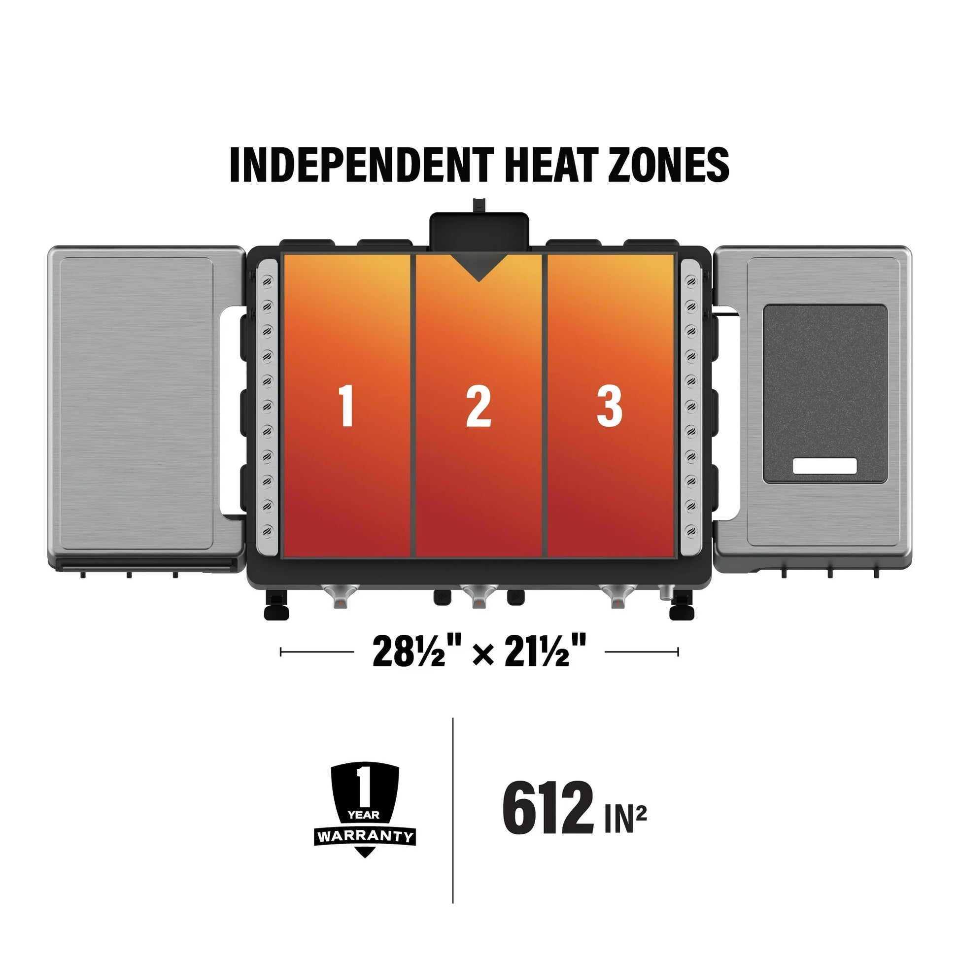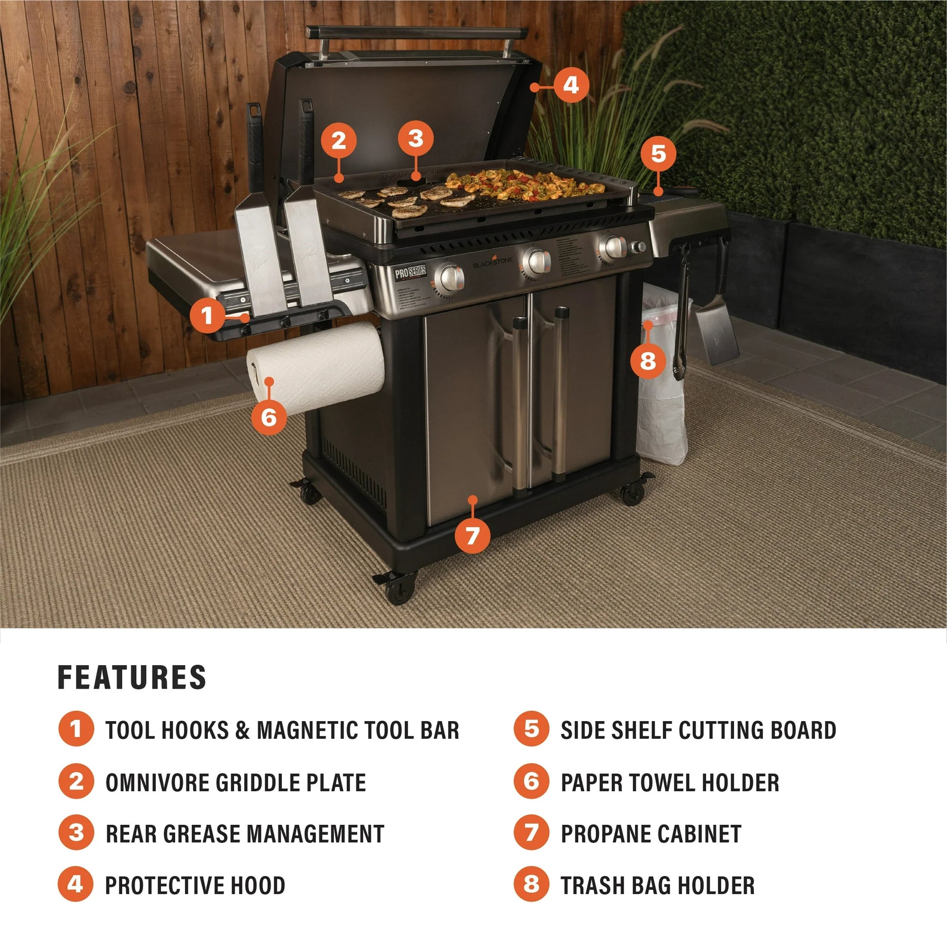 Blackstone ProSeries 3-Burner 28” XL Propane Griddle with Stainless Steel Cabinet and Hood The newly designed Omnivore griddle plate with built-in wind guards is designed for quick heating and heat maintenance across the griddle surface while preventing warping and using less propane Additional cooking space and burner compared to classic 28” griddles with 612 sq. in. cooking area and 3 independent heat control zones Tool hooks and magnetic tool bar to keep tools handy during cooking process Rear grease management system to prevent grease from dripping down the front of the griddle and making it easier to keep extra grease off cooking surface Protective hood to keep griddle top clean and safe Side shelf cutting board to make meal preparation smoother Folding side shelves to make it easier to store griddle Paper towel and trash bag holders to help keep things close for prep and cleanup Propane cabinet to hide propane tank while keeping it easily accessible 24,000 BTUs - The Omni griddle plate requires fewer BTUs to produce high heat, optimizing fuel efficiency