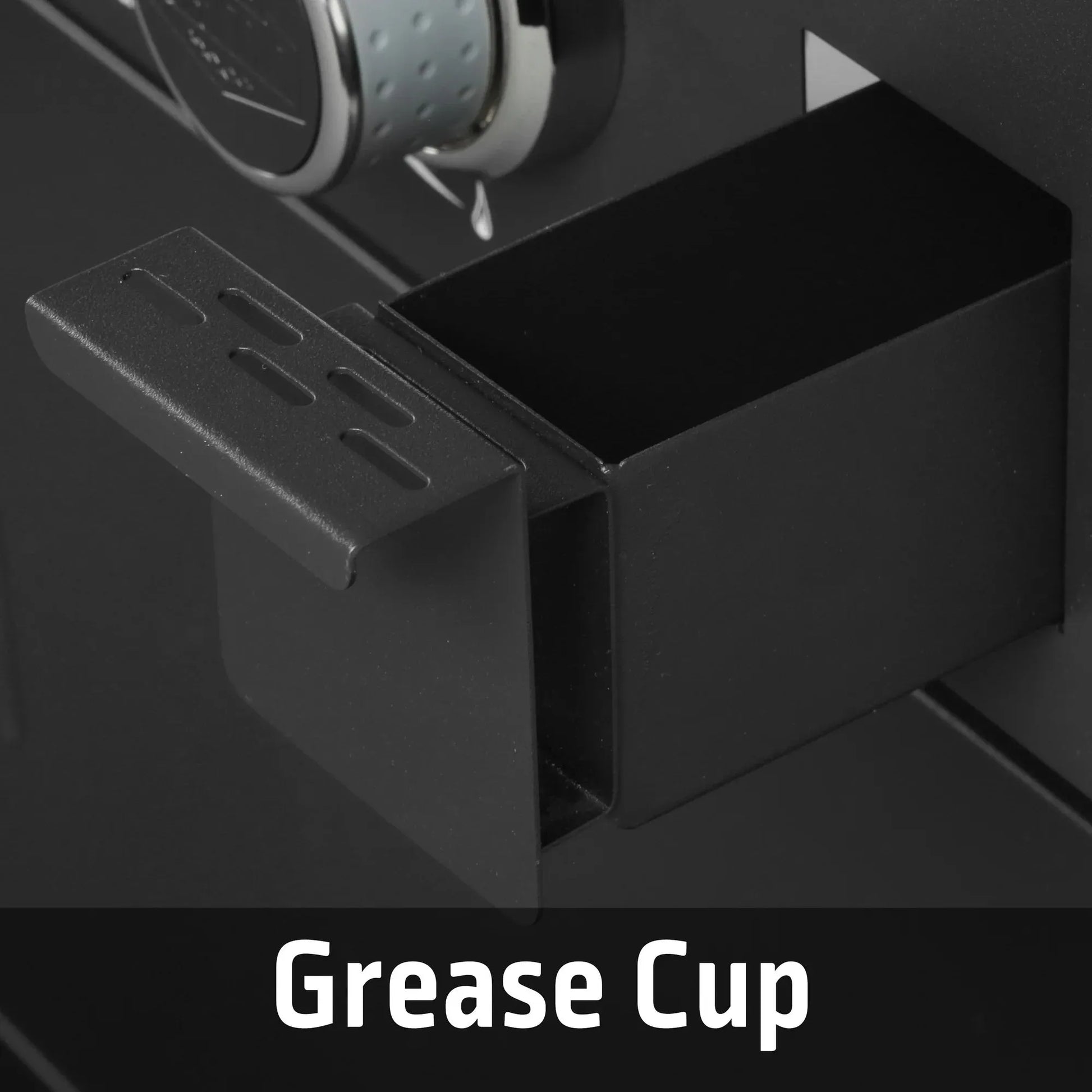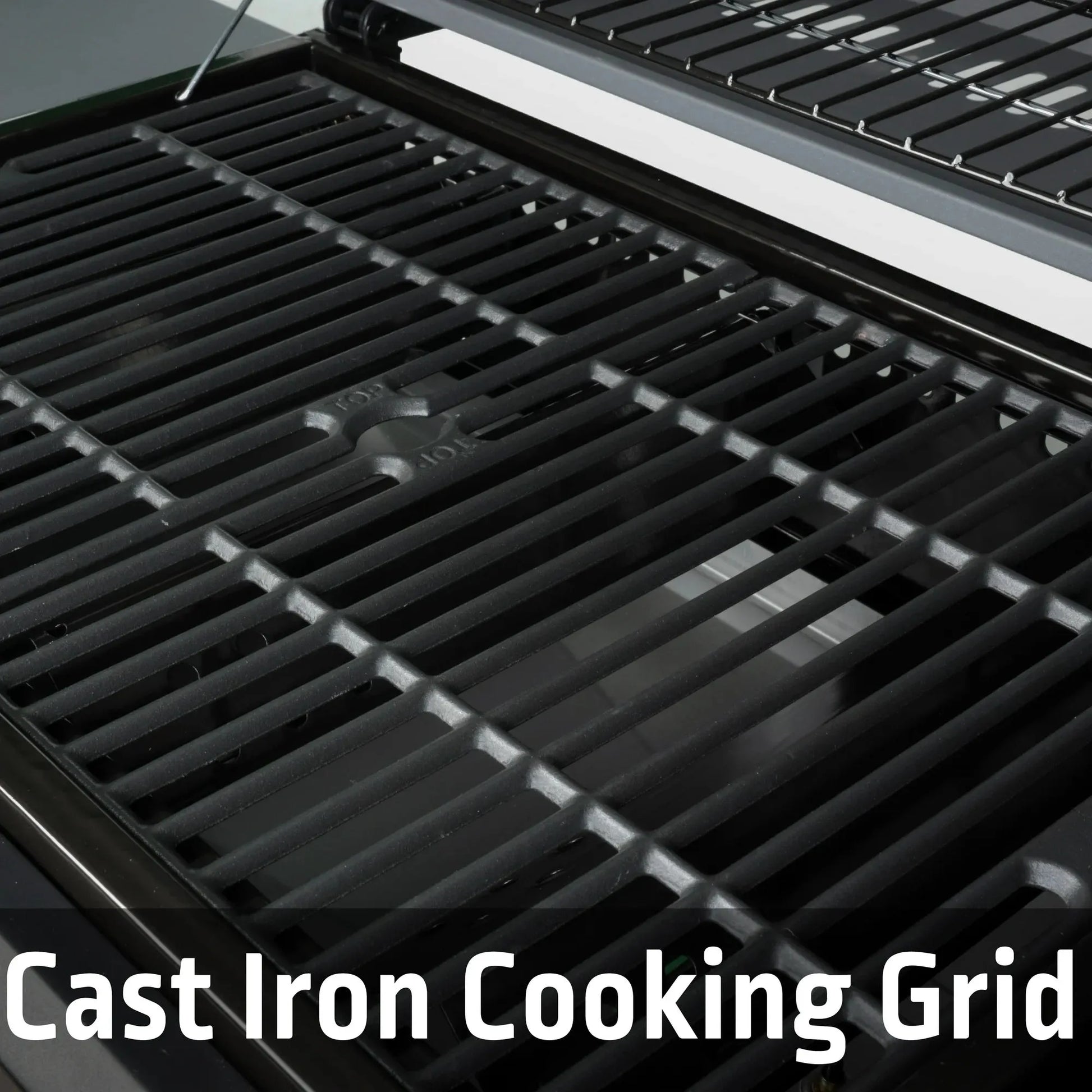 - Porcelain coated cast iron cooking grids on the gas grill side