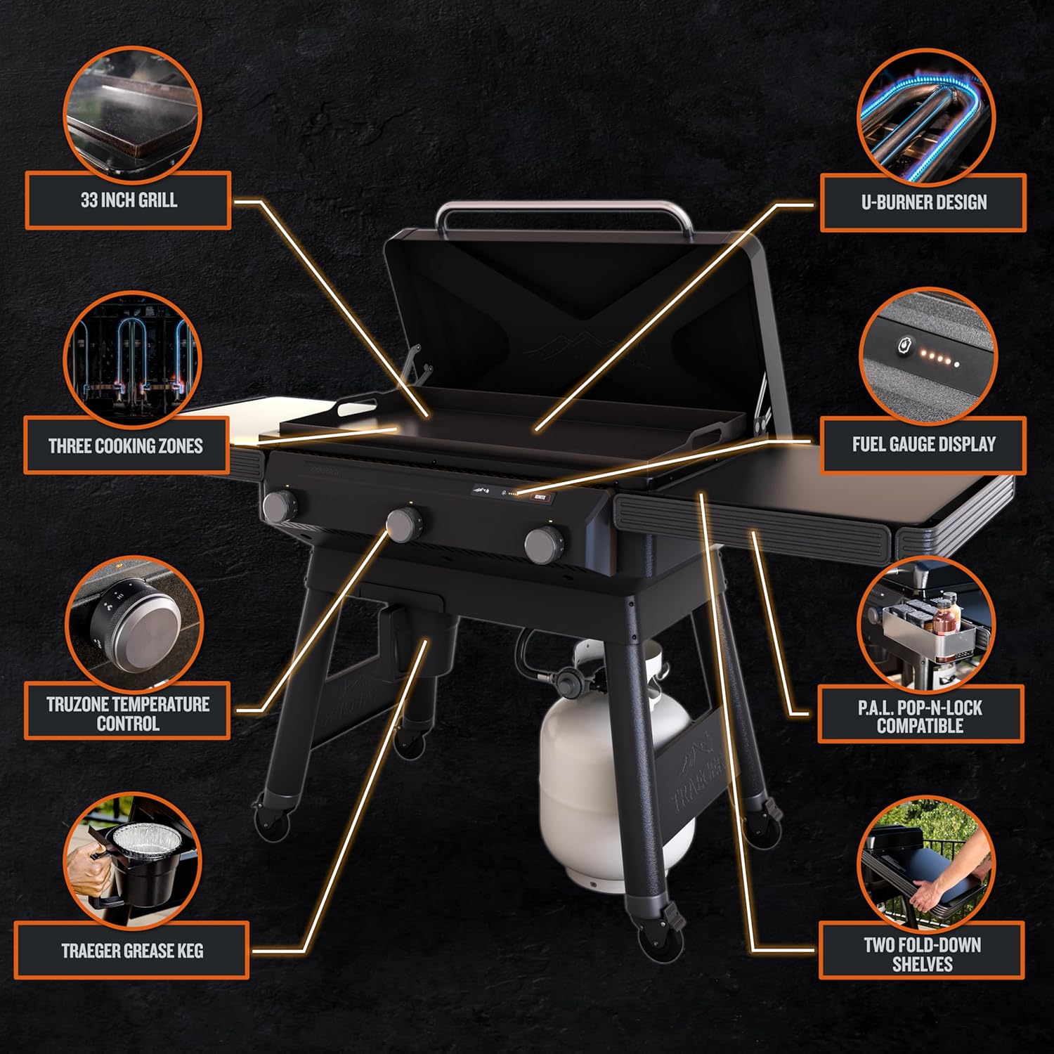 33 Inch Flat Top Griddle, Outdoor Gas Grill with 3-Zone TruZone Cooking, Even Heat, Fuel Sensor, and EZ-Clean Grease Management, Premium Propane Griddle for Outdoor Cooking